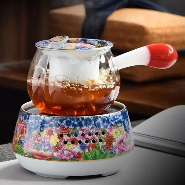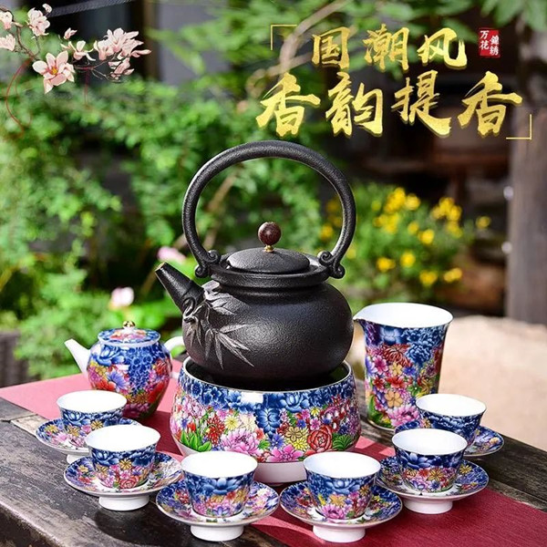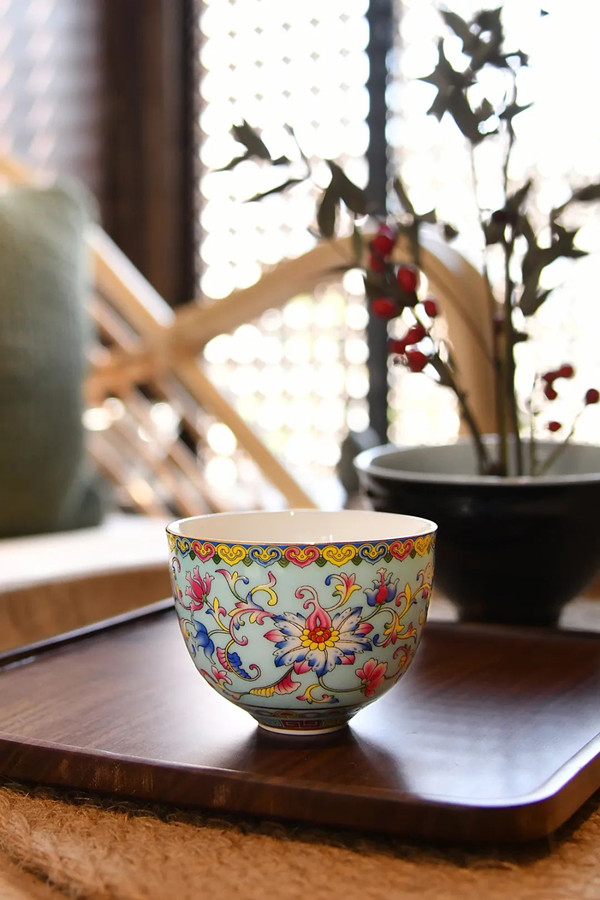 壶口至壶身上部饰以青花,透着清新淡雅的古韵风味;壶身中部簇拥着团团热烈绽放的花朵,色彩运用大胆浓烈,尽显雍容姿态;描金线条分出的壶身底部,皆为白瓷身骨,仿佛托举着上方的花朵们——青花、珐琅、描金,集于茶壶一身,得名“万花不落地”。