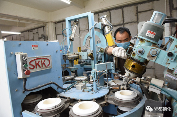 (在德化县陆升集团车间,工人检查陶瓷坯体完整度)
