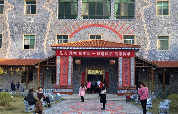 游客在陶瓷屋前驻足游览拍照