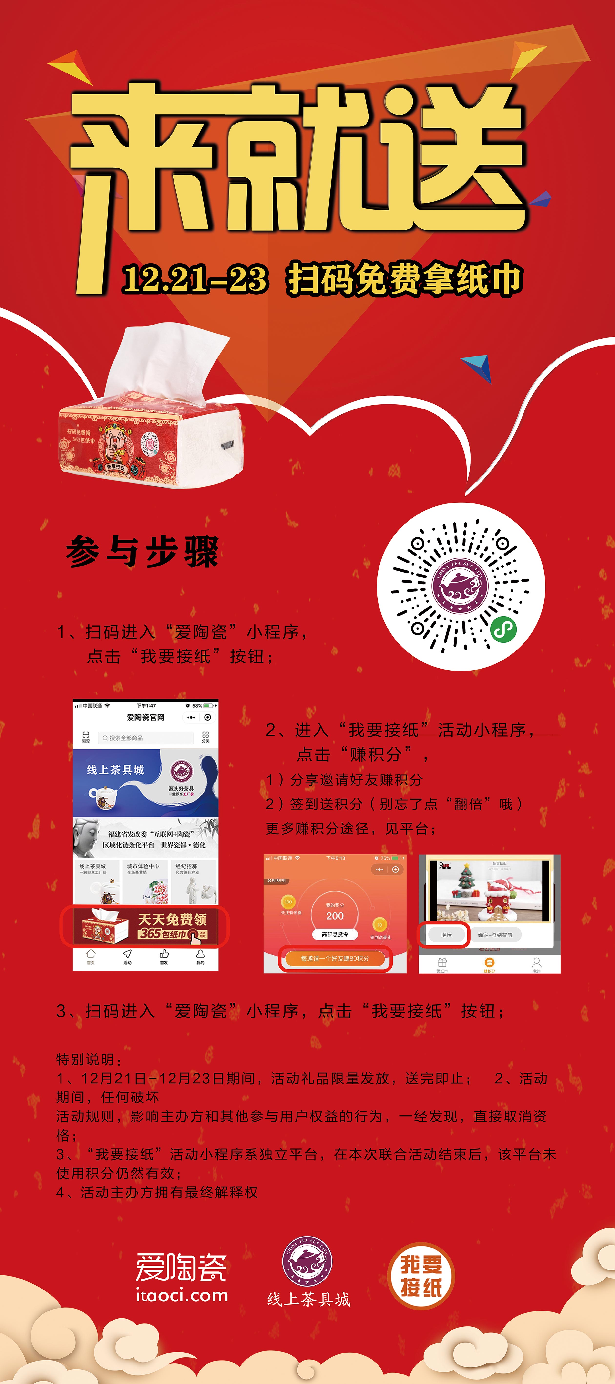 12月21日-12月23日茶博会期间,爱陶瓷展馆(T-07 ),来就送,扫码免费拿纸巾。