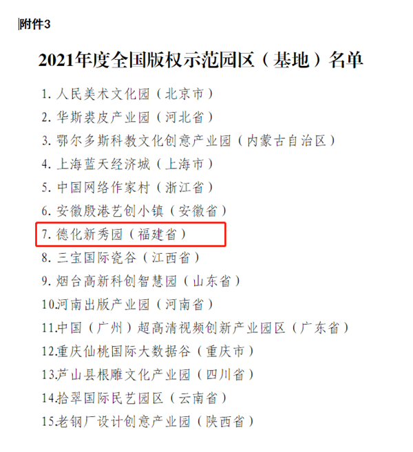 日前,国家版权局公布了2021年度全国版权示范单位、示范单位(软件正版化)和示范园区(基地)名单。在全国版权示范园区(基地)名单上,德化新秀园榜上有名,祝贺!