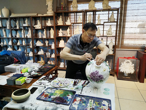 人物名片:徐华文,国家一级(高级)技师、工艺美术师、中华佛教艺术名家、德化县美术家协会常务理事。1978年出生于德化,2014年创立福建德化瓷漆器陶瓷文化创意有限公司,从事瓷漆器、手工雕刻、绞胎技艺。2019年4月应邀参加“匠心同源”——首届中韩当代工艺大师(大韩民国国会)邀请展。