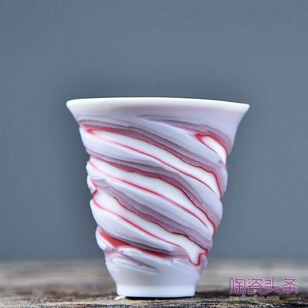 除了玉瓷大漆杯之外,徐华文通过绞胎工艺,设计创作的玉瓷绞胎杯系列,作为他作品中的一项全新工艺,又再次突显了他独出心裁的艺术理念。“绞胎工艺不是德化的传统技艺,在德化几乎没有人做这项工艺,所以我很好奇它与德化白瓷之间会擦出什么样的火花?”