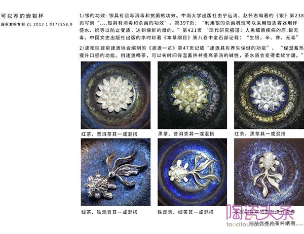 2012年底,李甲栈抱着尝试的态度,经过多方请教与研究,成功研制出将白银与天目瓷无缝无毒结合的银瓷生产工艺。雕饰成各种精美样式的银制品,与七彩梦幻的窑变釉,在不同茶水的作用下,颇为美妙有趣、变幻莫测。