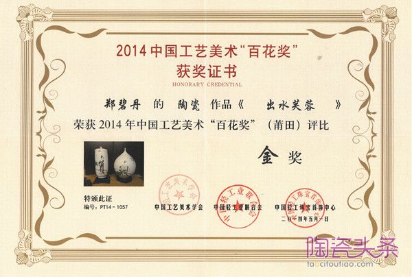 2014年5月《出水芙蓉》荣获2014年中国工艺美术“百花奖”(莆田)评比金奖;