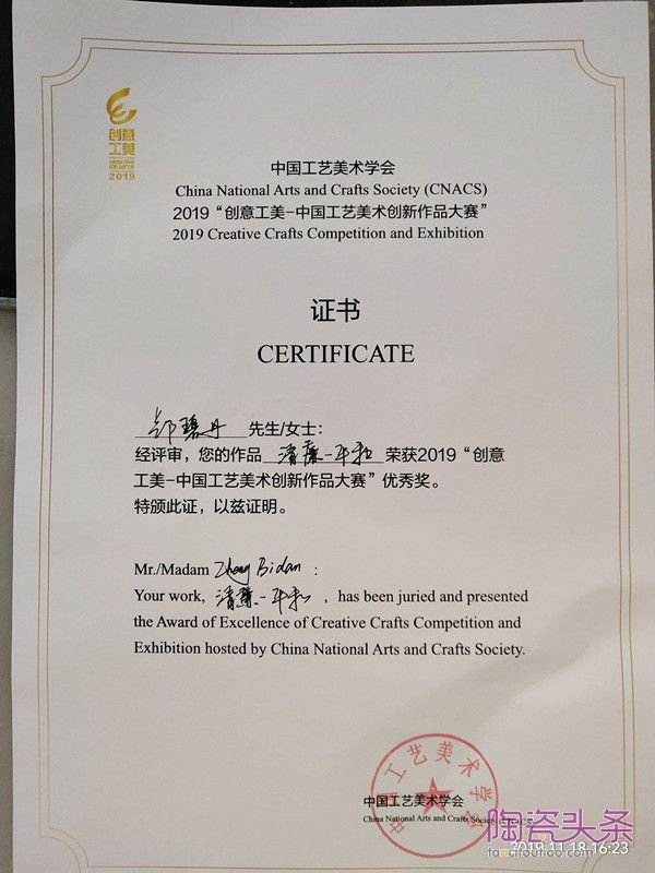 2019年《清廉平和》入选首届“创意工美---中国工艺美术创新作品大赛”并被评为优秀奖;