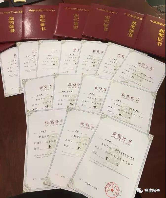 福建省陶瓷行业协会和德化县陶瓷发展委员会办公室积极组织企业参加第十一届中国陶瓷艺术大展,德化“”及建阳“建窑建盏”共计300多件作品在龙泉展出。福建产区66件作品获奖,其中金奖11件,银奖20件,铜奖35件。