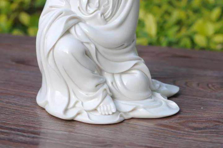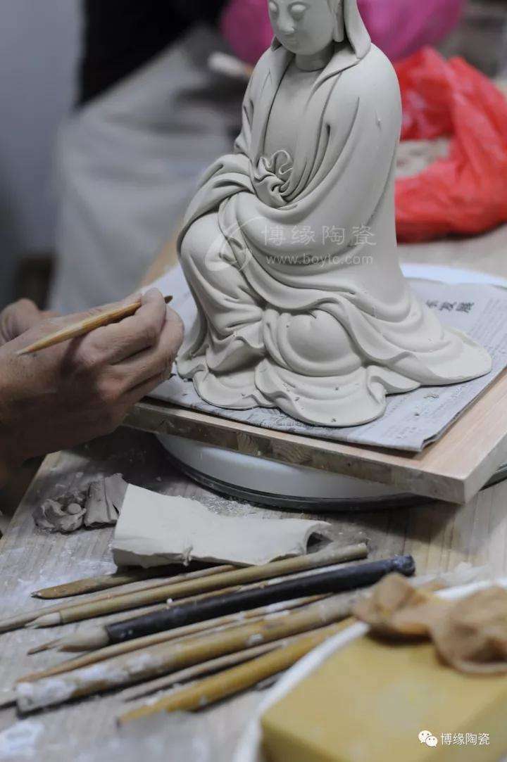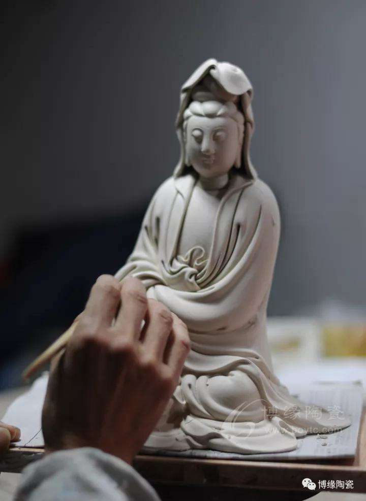何派观音雕塑注重于细节之美,精益求精,故而十分着意衣纹的刻画,使线条流畅,翻转自然。观其佛像,仿佛有春风拂面,衣袂飘扬的出尘之感。而今德化陶瓷观音作品,在继承前人优秀技法和何派风格的同时,不断创新发展,赋予作品新的现代生活气息,使作品更加贴近生活。