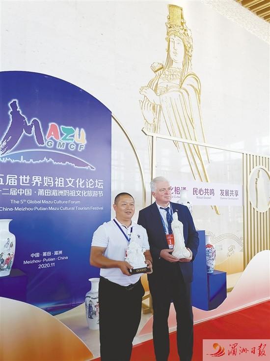 杜尚·贝拉手捧妈祖像高兴地说,在斯洛伐克生活、工作的华人有3000多名,斯中两国人民非常友好。这两尊妈祖像会让他难忘在湄洲岛特别美好的旅程。他会把妈祖像带回斯洛伐克,向斯洛伐克民众介绍妈祖“立德、行善、大爱”的精神,介绍中国的陶瓷工艺,这非常重要。