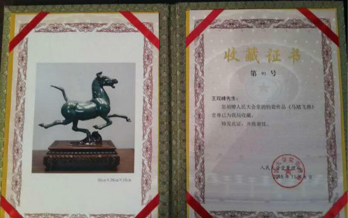 近日,中国陶瓷艺术大师、中国传统工艺大师、禹州市正玉钧窑创始人王现锋的钧瓷珍品《马踏飞燕》被人民大会堂收藏并颁发收藏证书,存放在人民大会堂金色大厅。