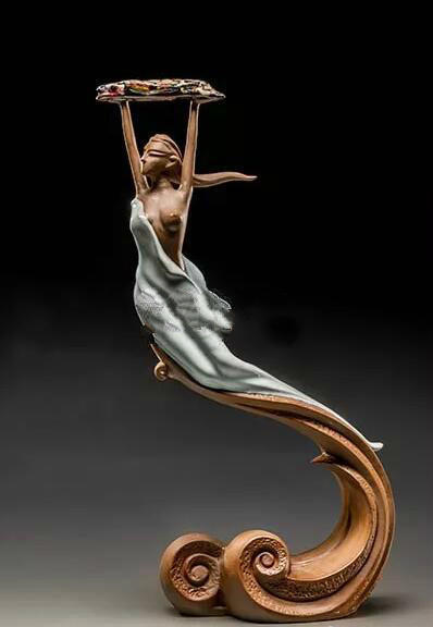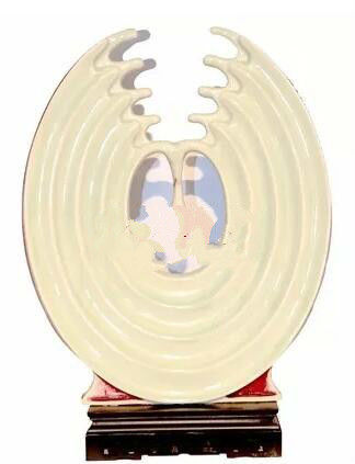 在《佛泉》上,一滴水滴下,形成道道水花往上翻涌。无须解释,欣赏之人很直观地能感受到这件作品的寓意。作品整体弧线优美,构思巧妙,一点钧红釉点缀在天青釉上,釉色搭配完美。中部进行镂空处理,恰似一颗心,寓意感恩之心。