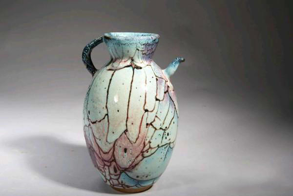 王秋红的釉也是一“独”。她像一个高明的化妆师,将不同的釉色恰到好处地融入不同的造型中。王秋红说,钧釉好比一块上好的衣缎,这是上天对“钧瓷人”的最高赐赠,但让什么人穿,是做唐装还是做中山装,必须根据每个人的实际情况量体裁衣,对于钧瓷来说,就是造型要和釉色相匹配。王秋红的釉色不是局限于“红白青蓝紫”和“蚯蚓走泥纹、珍珠点”的宋钧遗韵,更多是以饱满浑厚、酣畅淋漓的釉质,通过炉火的煅烧来实现激情奔放的色彩,如厚重神秘的“黑唐钧”、文雅朴实的“鸽子蓝”、富有时代气息的“铁皮釉”、斑驳离奇的“火焰纹”等,都是她在传统钧釉的基础上增加的一些新的着色元素,使釉色进一步丰富,五彩斑斓,如诗如画。