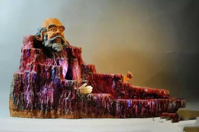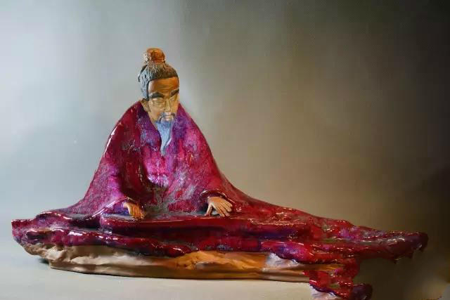 创作《十八罗汉》时,他运用现代陶艺的设计理念,充分融入写意性,以山取势,以石窟文化为背景,以夸张的想象为创作形式,采用粗犷的匣钵泥料,运用泥饼拼接和泥条盘筑法成型,并有意塑造山势与人物姿态的相像度;随后,在泥型的几个断面或凹凸部位,巧妙地安排人物头部;同时,采用大小适宜的洞窟点缀形之态,以多变的发式和胡须走向强化意境,追求强烈的视觉冲击力。