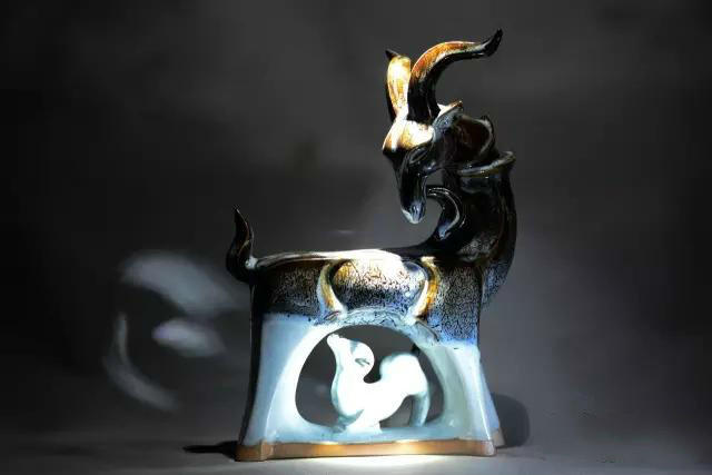 2015年是农历羊年,贺文奇烧制出了300多只钧瓷羊。绵羊的忠诚与善良,山羊的小巧与顽皮,岩羊的勇敢与智慧……在这批生肖羊作品中,贺文奇运用纯手工泥片塑造法制作羊的身体,形成千姿百态的形态之美;运用捏塑手法塑造羊的头部;运用泥条的粗、细、长、短、曲、直展现羊角的灵动之势。