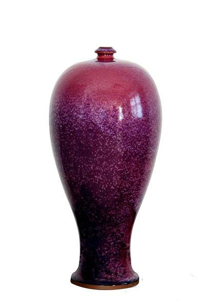 有人说性格决定命运,这句话是否正确暂且不论,但就钧瓷界来说,性格与作品的风格基本上是一致的。“钧瓷狂人”李占伟的钧瓷艺术风格,处处体现着狂放不羁的大气之美。他大胆进行创新,改变了很多传统器型的比例、尺度,这是对传统的颠覆和反叛,也是传统基础上的尝试和创造。如《和尊》,传统的《合尊》来源于青铜器,广口、鼓腹、圈足,而李占伟创作的钧瓷《和尊》,上部极为广阔,由上而下经过自然过渡后极致收缩,下部仿佛即将承受不住上部的重量。“有陶瓷界的前辈看到我这件作品时,说我的比例不对。如果以传统造型来说,确实如此,但如果你将我的作品看作一朵正在盛放的花朵,就会觉得很合适。”李占伟说。确实,这件作品下部是花的骨朵,上部是盛开的花瓣,搭配钧红釉之后,自然而灵动。再如《出戟尊》,李占伟为了使釉面得到更好的表达和展示,将其顶部删繁就简,使其形似盛开的莲花,夸张而又古朴淳厚。还有我们熟知的《玉壶春》,李占伟改变了它从明代以来颈短、腹圆下垂的特征,对其颈部进行拉伸,这和传统制式有所不同,对此,他的说法是:“颈长,就会显得瓶式修长。在我的审美里,我认为它美,所以就把其中的部分拉长了,夸张了。大众审美,随着时代的变化,也该有变化。”