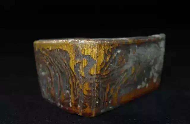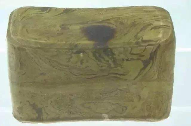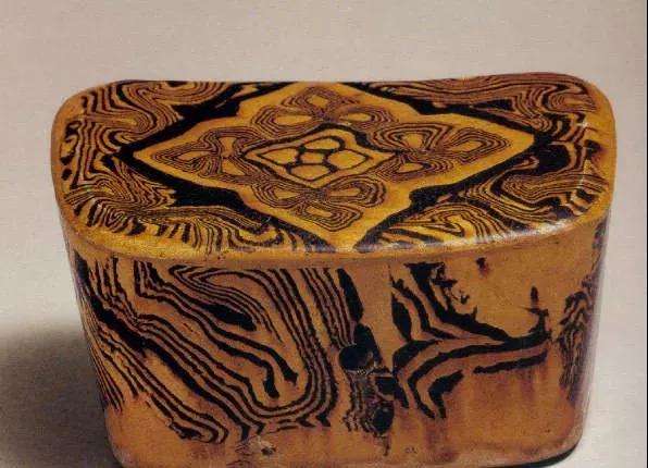 绞胎釉填彩“杜家花”枕,晚唐。高11.2厘米 长22.1厘米 宽13.2厘米