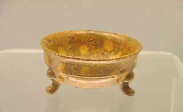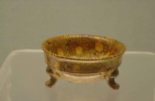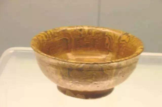 扬州博物馆的“唐代巩县窑黄釉绞胎碗”,纹理变化多端,线条犹如行云流水,是唐代陶瓷业中的一种新工艺,为河南巩县窑产品。唐碗高4.2厘米、口径10.4厘米、底径5.4厘米,敞口外撇,圈足底。于1990年在市汶河北路信托大厦工地出土。