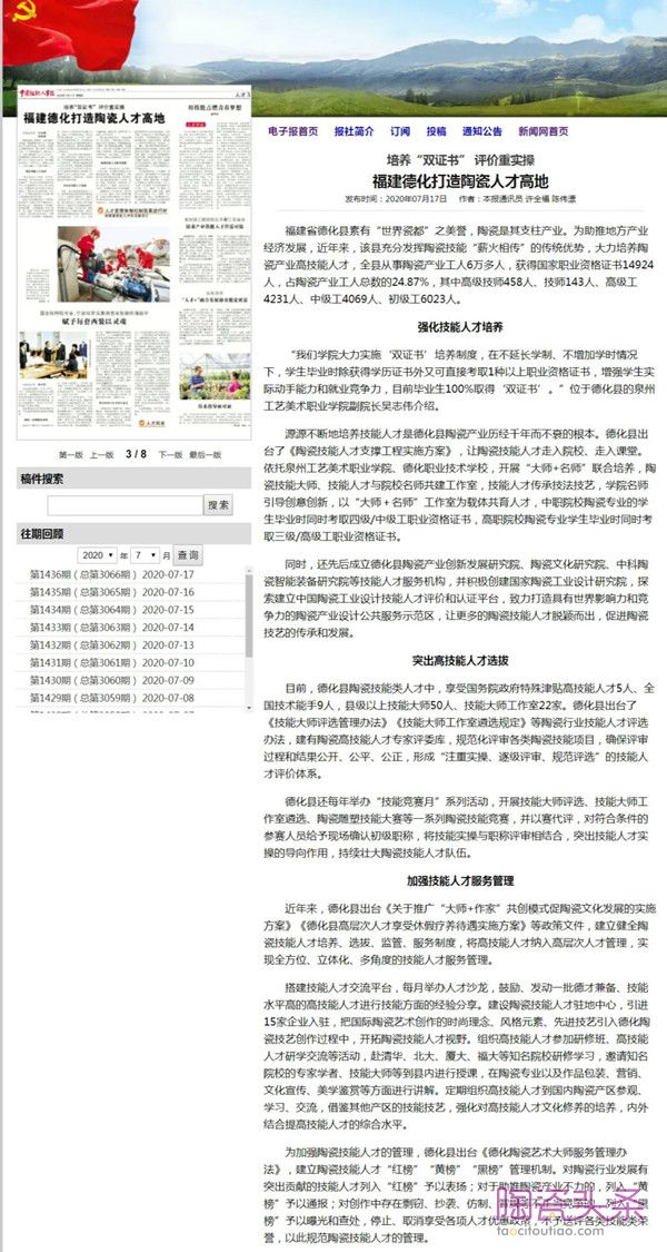 7月17日,《中国组织人事报》以《培养“双证书” 评价重实操——福建德化打造陶瓷人才高地》为题,报道德化县陶瓷技能人才培养工作。现将其转发分享。