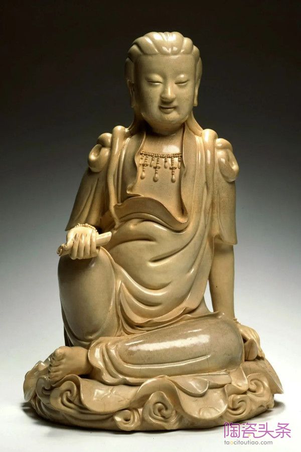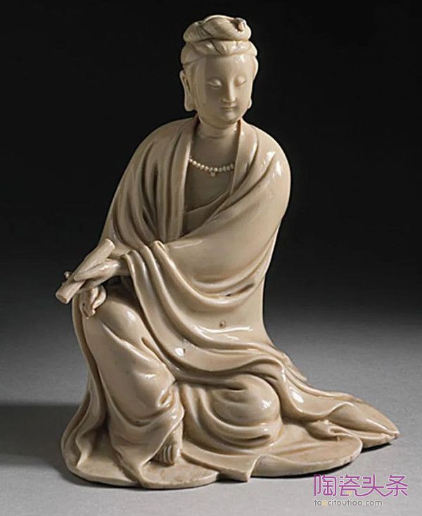 通体施白釉,施釉均匀,胎质细腻,凝脂似玉,象牙色的瓷质,白中泛黄。明代德化窑白瓷极力追求完美的玉质感,在瓷坛上独树一帜。此像多次出现在国际拍卖市场上,深为国际收藏家所推崇。(来源:旃檀精舍)