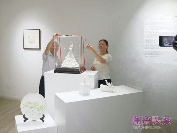 致辞环节后,锦江区文化馆馆长张红波先生与古迹酒店负责人龚媛媛女士进行了现场别样的剪彩仪式,共同揭开由苏华羽、曾巧霞夫妇创作的德化白瓷捏花作品红色彩带。至此,本次展览顺利开幕!