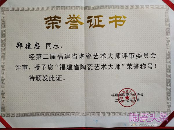郑建忠,男,汉族,1986年12月生于福建德化,师从中国工艺美术大师、国家级非遗传承人陈明良。现为全国陶瓷行业技师能手、国家一级(高级技师),福建省陶瓷艺术大师、福建省陶瓷行业十大新锐人物、福建省闽派雕刻艺术大师、福建省工艺美术名人、泉州市工艺美术大师、福建省美术家协会会员、福建省陶瓷行业技术能手、福建省手工艺术技术能手、泉州市高层次人才、福建省陶瓷行业协会常务理事、福建省雕刻艺术家协会理事、福建省手工艺协会常务理事,现为德化县至鼎陶瓷研究所艺术总监。