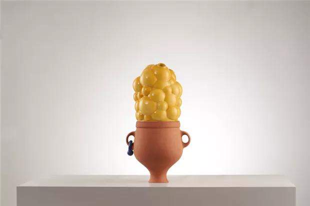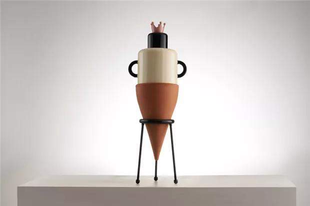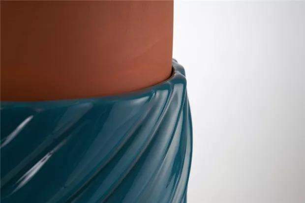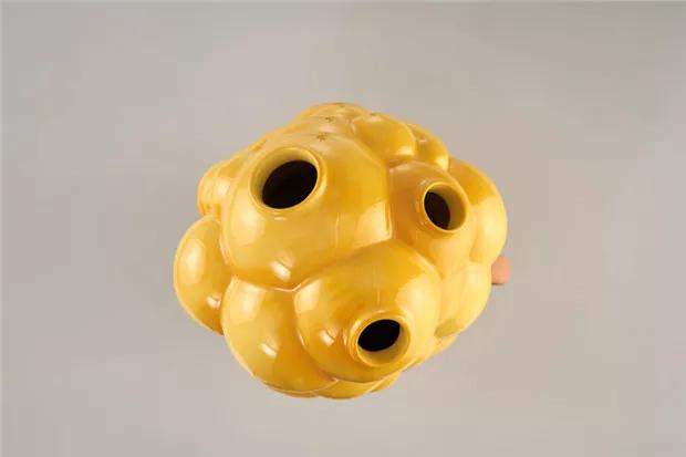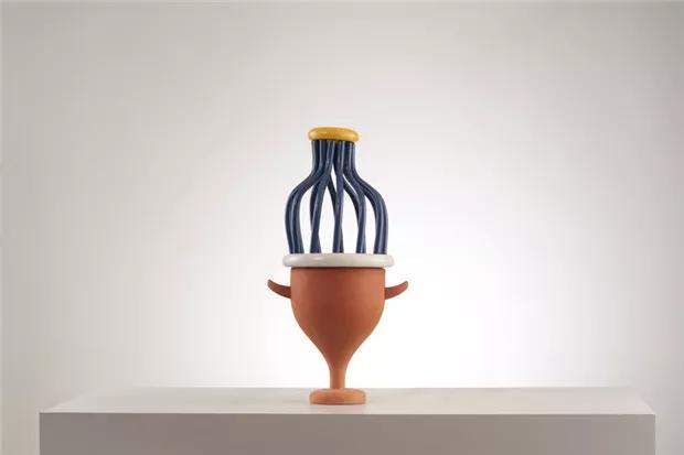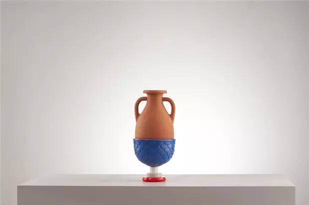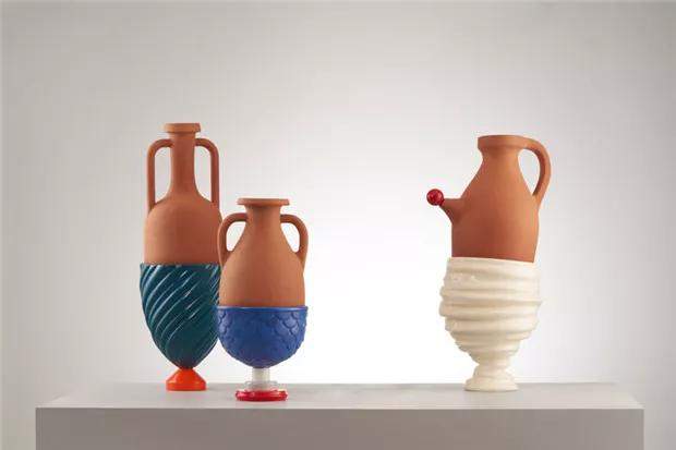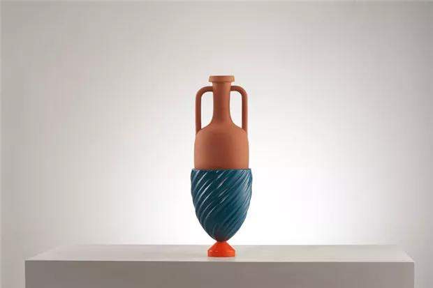 “hybrids”处理了两种材料之间的反差,同时用不同寻常的方式将二者连接起来。系列中的作品传达出多种不同的并置关系,包括古老形态与电脑生成形态的并置;纹理之间的并置:哑光与亮面、粗糙与光滑;色彩之间的并置:天然赤陶土色与白陶表面明亮的高饱和色。每款花瓶都由两部分组合而成,赤陶土材质的一半采用了大家熟知的古陶器形态,而白陶材质的另外一面的形态则利用3D软件生成,均为非自然的形态。为了保证两种完全不同的材料顺利结合在一起,设计者采用了特殊的方式,让两部分在整个制陶过程中都连接在一起。这些作品共同风干共同烧制,分别施釉再放置在一起经过组装再入窑炉完成最终的烧制。在烧制过程中两部分最终完全融合在一起。