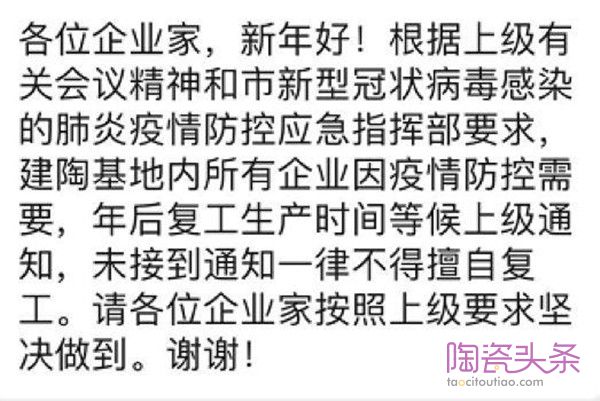 有行业人士指出,虽然大部分陶企计划在2月10日复工复产,但不少企业可能会面临无法按预期开工的困难。一是,不少产区政府要求“企业开工等通知,未经允许不得擅自开工”;二是,部分企业担心疫情进一步扩散而选择不开工;三是,员工无法按时返岗使得企业无法按预期开工。