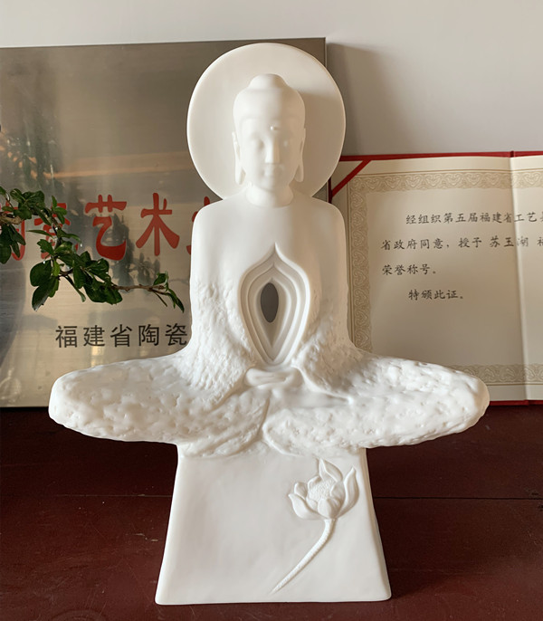 2007年,苏玉湖决心回到德化,从事陶瓷雕塑设计。“润、透、白的德化陶瓷用于雕塑创作,能呈现出不同于其他泥土做的雕塑品的效果。我自小对这种瓷土就情有独钟。”苏玉湖说道。