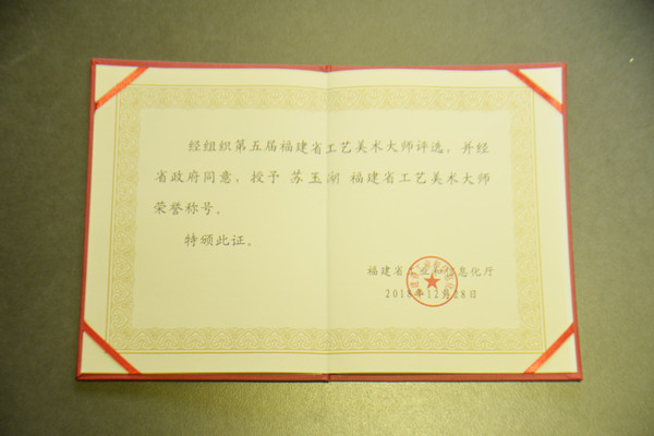 人物名片:苏玉湖,男,1979年出生于德化,1999年7月毕业于福建省德化县职业中专学校,2016年5月毕业于泉州市工艺美术学院。2015年创办德化县瓷来瓷往工艺陶瓷研究所,现为福建省工艺美术大师、福建省陶瓷艺术大师、泉州市工艺美术大师、高级技师(国家一级)、泉州市高层次人才(第三层)、福建省雕塑专家(陶瓷雕塑)、福建省闽派雕刻艺术大师。2016年9月24日荣获首届华夏工匠(华夏陶瓷雕塑名师),2018年2月荣获第二届德化县优秀青年人才荣誉称号。