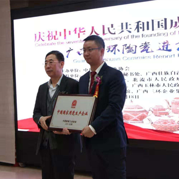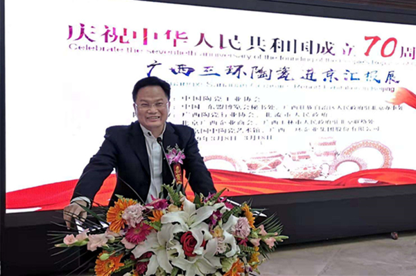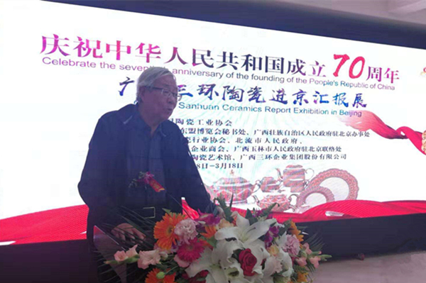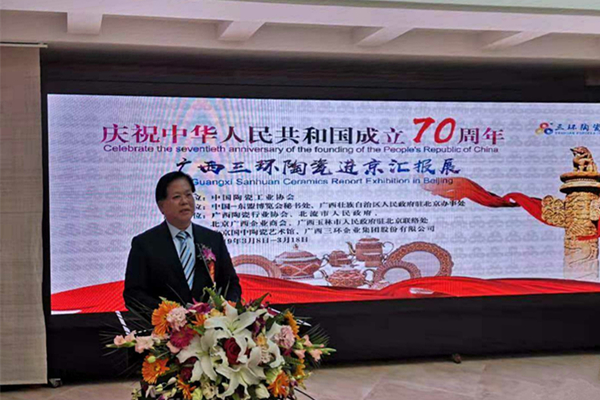 为庆祝中华人民共和国成立70周年,广西三环陶瓷进京汇报展于2019年3月8日在北京国中陶瓷艺术馆开幕。中国轻工业联合会、中国陶瓷工业协会、中国轻工工艺品进出口商会、中国东盟博览会秘书处、北京广西商会有关领导, 玉林市副市长刘胜友、北流市市长李岗、副市长高巍、三环集团董事长陈诚等出席开幕式。