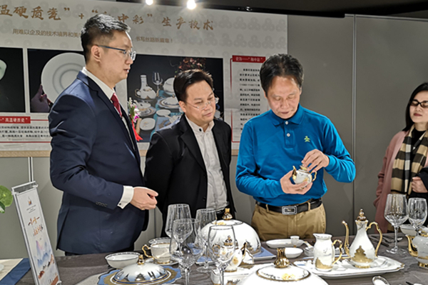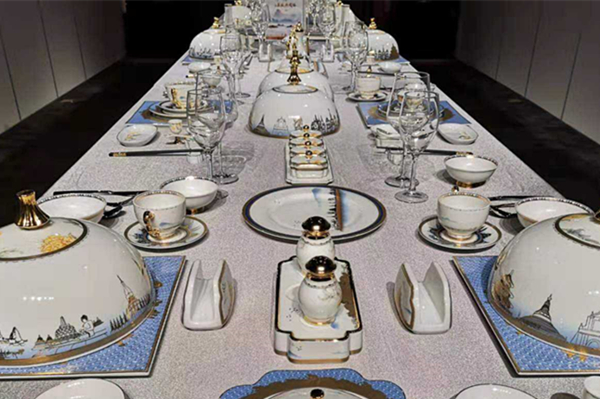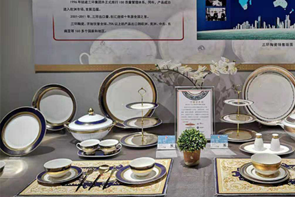 汇报展上,三环陶瓷融合了具有突破性创新的二次烧成高温硬质瓷生产技术及领先业内的釉中彩生产技术,打造出特别为庆祝中华人民共和国成立七十周年制作的宴会餐具——“一带一路——东盟共同体”,用高技术书写丝绸之路新篇章,打造广西文化名片,成为广西陶瓷产业转型升级的典范。汇报展展出了三环集团历届的东盟国礼产品、具有文化内涵的高附加值陶瓷精品、高科技陶瓷产品等。的积极贡献,同时期望三环陶瓷今后取得更大的进步。