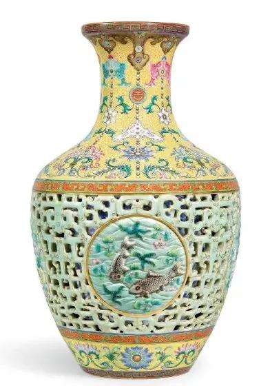 据说,清乾隆洋彩黄地粉青透龙夹层吉庆有余玲珑尊与2010年以4300万英镑落槌的著名乾隆洋彩玲珑尊成对,著录于1905年纽约山中商会图录,为御窑督陶官唐英所制最巧夺天工瓷器之一。