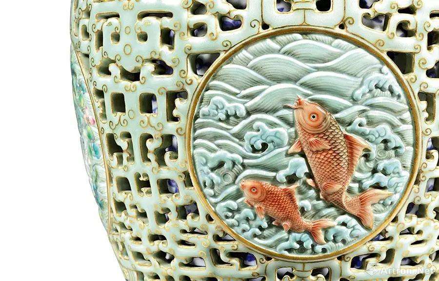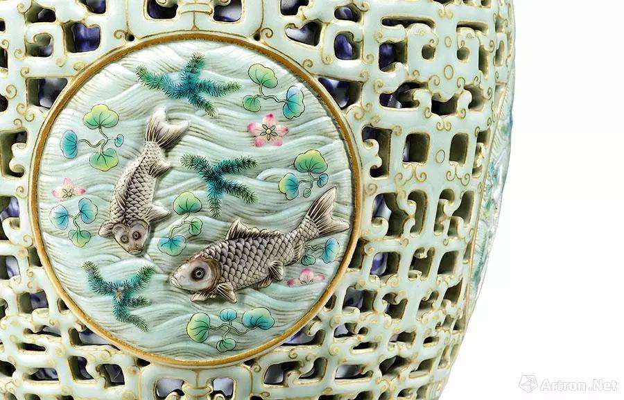 清乾隆 洋彩黄地粉青透龙夹层吉庆有余玲珑尊 (局部)