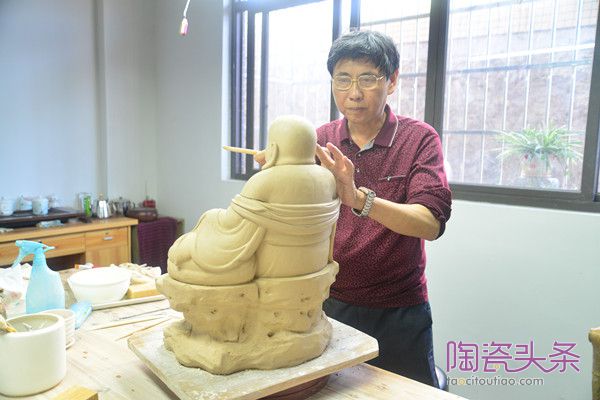 笔者去采访陈进宝时,他正在工作室里,全情投入地修饰一件大型弥勒佛泥稿,女儿陈淑莉在一旁给他打下手。陈淑莉从16岁跟随父亲学习瓷雕技艺,到如今帮父亲打理研究所的日常事务,已有十六载时光。她可以说是最熟悉陈进宝瓷艺创作的人。因此,此次访谈对陈进宝瓷艺之路的认知,更多是从陈淑莉口中得知。