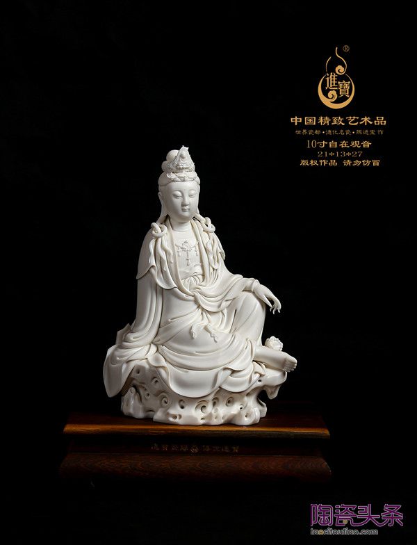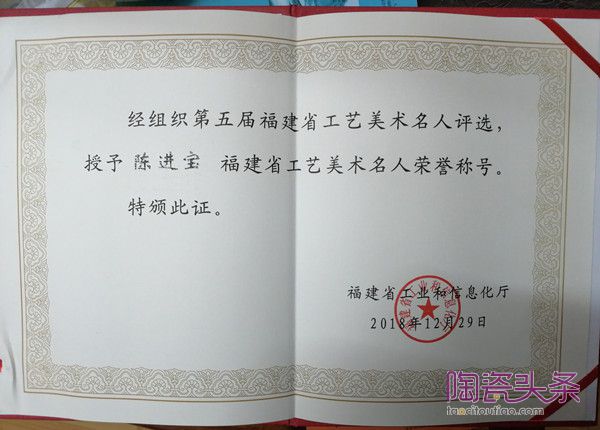 陈进宝,福建省陶瓷艺术大师,高级工艺美术师,福建省工艺美术名人,中国陶瓷艺术名家,1959年11月出生于瓷都德化,自幼酷爱陶瓷,上世纪70年代初就与瓷结缘,师从中国工艺美术大师、中国陶瓷艺术大师、国家级非物质文化遗产代表性传承人苏清河三十余年,现任德化县进宝陶瓷文化艺术研究所所长。2016年荣获“福建省陶瓷艺术大师”荣誉称号。2001年荣获“福建省民间艺术家”荣誉称号;2008年荣获“重建汶川爱心大使”荣誉称号;在各大专业比赛中荣获金奖,多件作品收藏于省博物馆和国外博物馆,作品深受业界人士和陶瓷爱好者的赞誉。