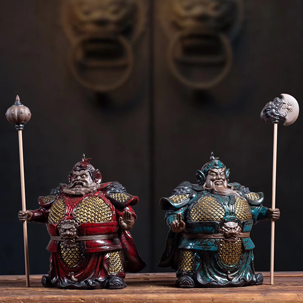 “《哼哈二将》一开始创作的版本是比较写实、传统,比如魁梧的身材、发达的肌肉、夸张的表情,看起来凶神恶煞的样子,让人不敢亲近,但这似乎不适合家居摆件。后来我们融入了一些萌态化的表现手法,让作品更具亲和力,同时又不失威严。”王顺介绍道。