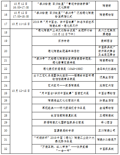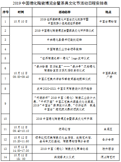 10月12日-15日,2019中国德化陶瓷博览会暨茶具文化节在中国茶具城举办。10月12日上午9:00在中国茶具城广场举行开幕仪式,欢迎广大市民莅临观礼!