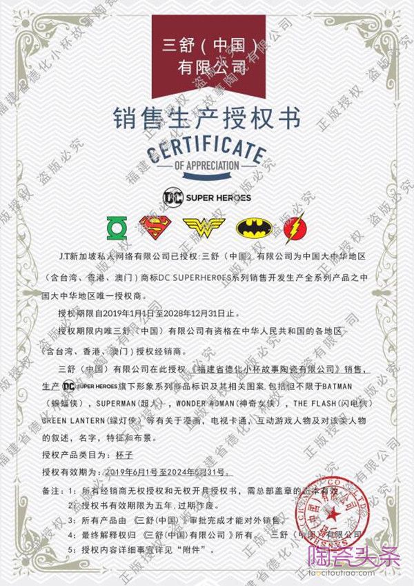 2019年4月,徐孝本前往广州与DC漫画商标授权公司三舒(中国)有限公司正式接洽。在历经多次协调沟通之后,6月中旬,正式与三舒(中国)有限公司签署商标授权合同,并立马着实准备产品的研发与生产。9月,徐孝本就迫不及待地在德化开起了DC正版授权的第一家中国陶瓷杯工厂店。