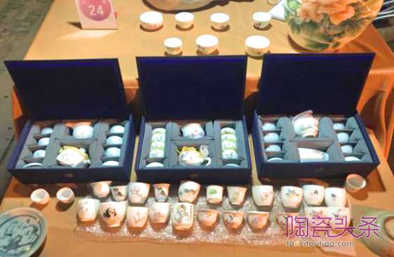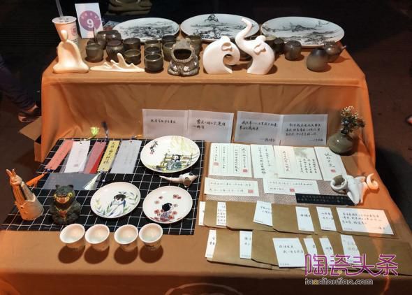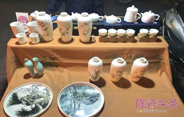 摊位上摆着各具特色的陶瓷艺术品,有瓷瓶等摆件、还有各类家居日用品类。