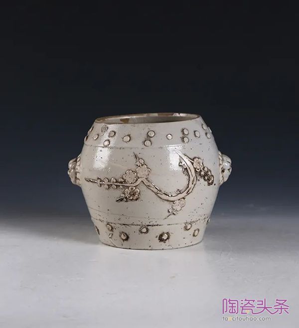 民国·白釉堆贴折枝梅花纹鼓形罐▲