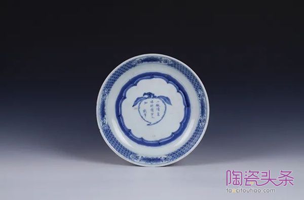 清·青花诗词寿桃纹盘▲