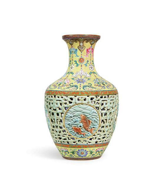 香港苏富比宣布,乾隆洋彩黄地粉青透龙夹层吉庆有余玲珑尊将为 2018 年中国艺术品秋拍揭开序幕。此玲珑尊曾著录于 1905 年纽约山中商会图录,自 1924 年纳入日本私人收藏近 一世纪。颈上黄地锦上添花,溢洛可可洋风,四面浮雕开光,各缀双鱼栩栩如生,从外瓶镂空夔龙纹,可窥 内瓶青花缠枝花卉,妙然生趣。此品制作殊艰,为御窑督陶官唐英所制最巧夺天工瓷器之一,与 2010 年以 4,300 万英镑落槌的著名乾隆洋彩玲珑尊成对,诚乾隆重器。