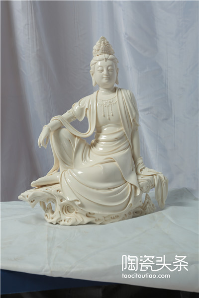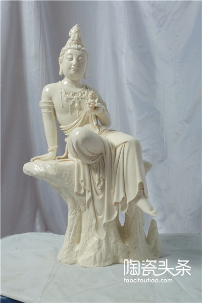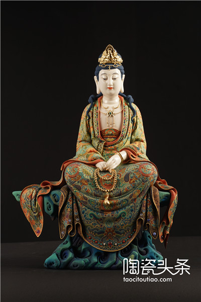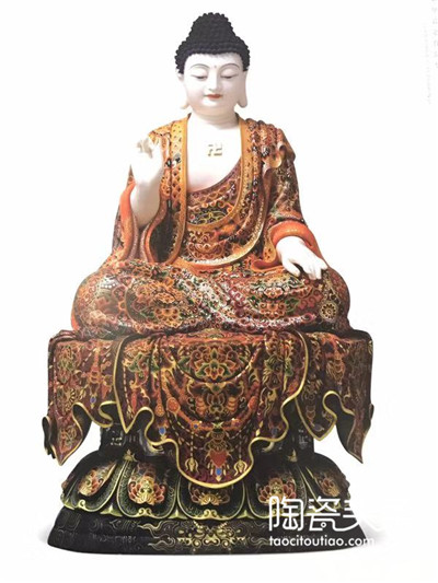 值得一提的是,连紫华在2009年耗时一年的时间,成功创作出融唐卡彩绘工艺技法的极彩白瓷塑像作品《释迦摩尼佛》。唐卡原料色彩华丽丰富,与朴素淡雅的德化白瓷相互补充,不仅带给我们全新的艺术审美,同时也让我们感受有别于传统宗教造像风格的作品。这是新时代下,传统艺术品的创新传承方式,而这种跨界材料的融合应用在当时也是首创,并且在德化陶瓷界引起了一股学习风潮。此后,他又独创在烧制好的瓷塑作品上融入宝石镶嵌工艺与金属铸造工艺,更是将宗教神像端庄华丽彰显出来,为我们带来更多元化的创作方式。