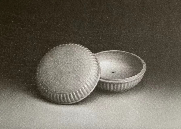 Two circular covered boxes with ribbed sides,dating of the 16th or 17th century,are decorated with a design of a flowering tree-peony or a lotus plants and waves in moulded relief(fig.1,2).They are covered with an ivory glaze.The flat base is unglazed and the inside bears three or four spur marks. One of the boxes has formerly contained seal vermilion paste.