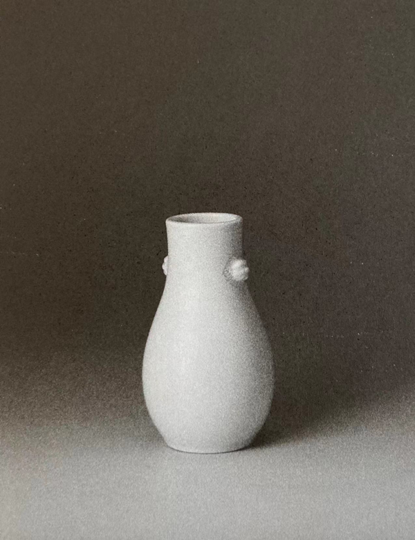图4:17世纪或18世纪初,细卵圆形小瓶宽颈,颈部两侧有一对称的浮雕狮子。釉底凹进,瓶表面施奶白釉。器型和装饰取自青铜器的形状。