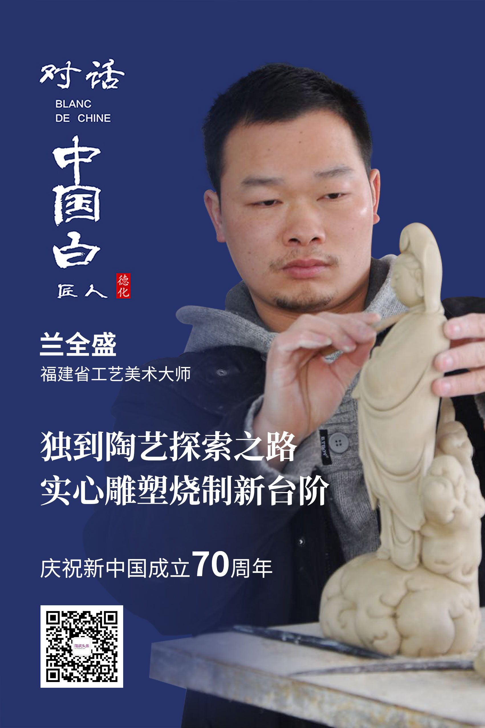出生于1981年的兰全盛,虽然年纪不大,但却有着二十年的“工龄”。1999年,兰全盛初中毕业后到泉州学习树脂雕塑,2000年在德化树脂公司做雕塑学徒,从事西洋小工艺品雕刻。2007年进入泉州工艺美术职业学院学习陶瓷雕塑,在这期间他认识了师父林建胜、张南章等许多德化著名的陶瓷艺术家,深感传统瓷雕艺术的特殊魅力。2010年,兰全盛转型开启了白瓷艺术创作崭新的一页,十一年的雕塑技艺积累,让他对传统瓷雕创作得心应手。