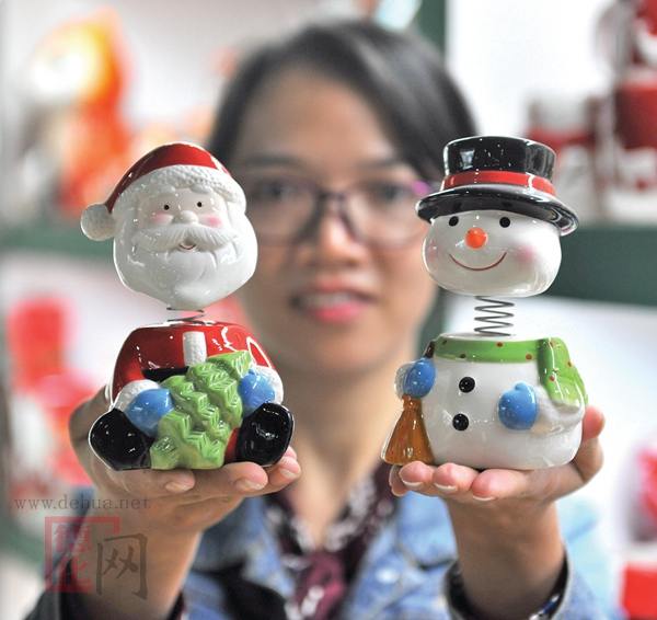 顺美集团公司工作人员展示圣诞节出口瓷新品