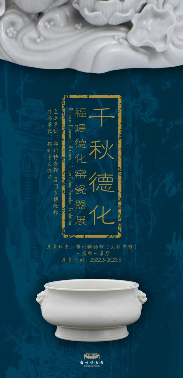 《千秋德化——福建德化窑瓷器展》由郑州博物馆、厦门市博物馆主办,遴选德化瓷精品124件(套),包含白瓷、青花瓷、酱釉、彩瓷,其中以白瓷为主;品类丰富,包含生活用具、文房用具、陈设器及各类塑像。通过“延烧千载 浮槎万里”“瓷国明珠 天下共宝”“千秋瓷业 历久弥新”三个部分,全面展示德化窑作为一个以外销为主要生产方向的民间窑场的发展历程、 魅力特征及其强大生命力。