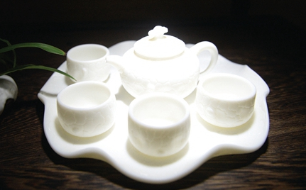 县长刘德旺(左二)和在场专家、企业负责人一起查看德化青花古瓷器。
