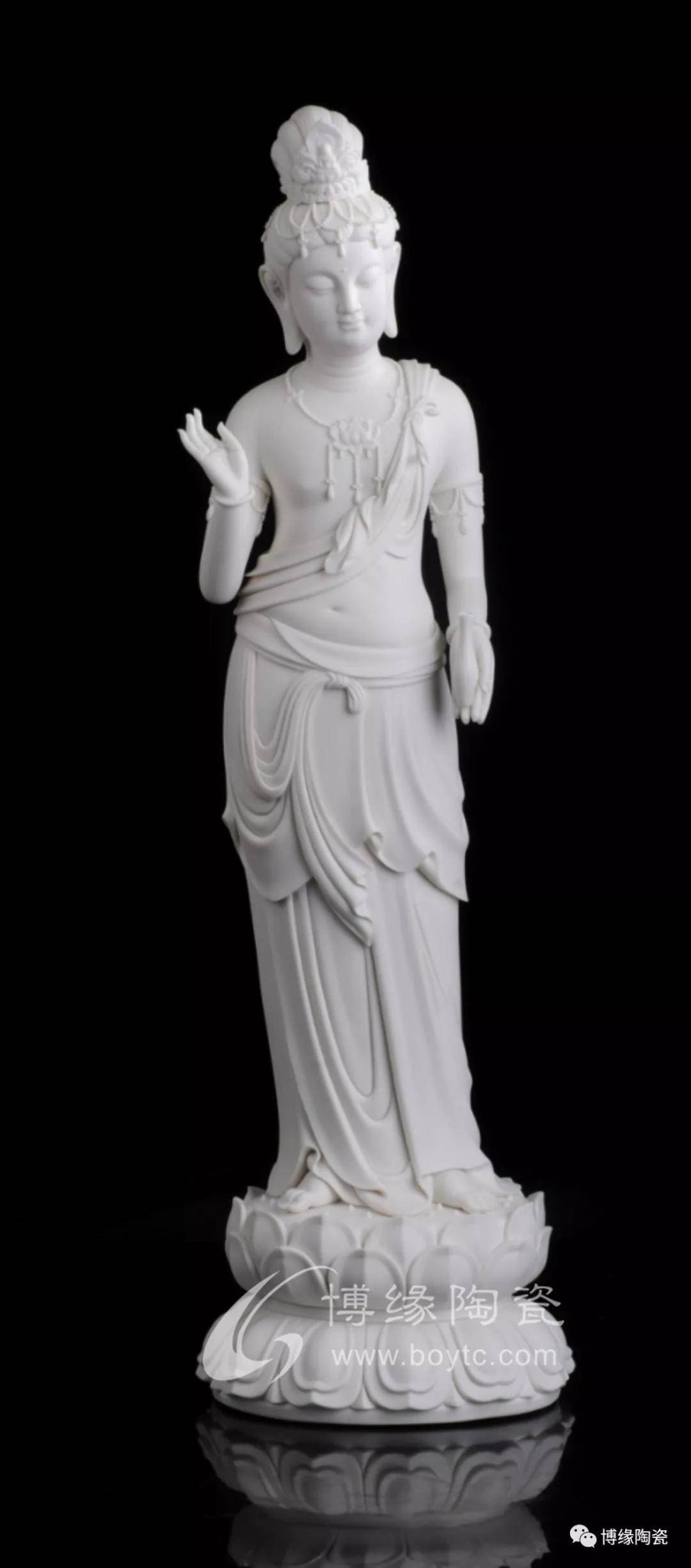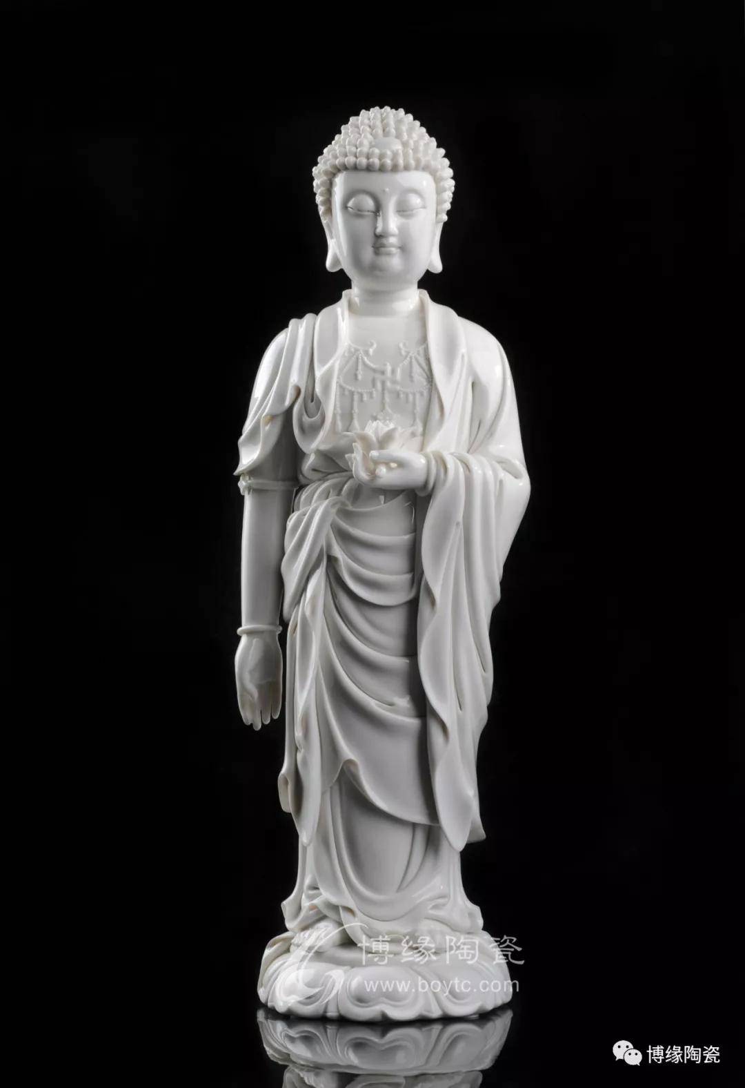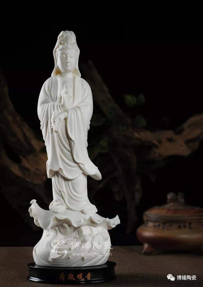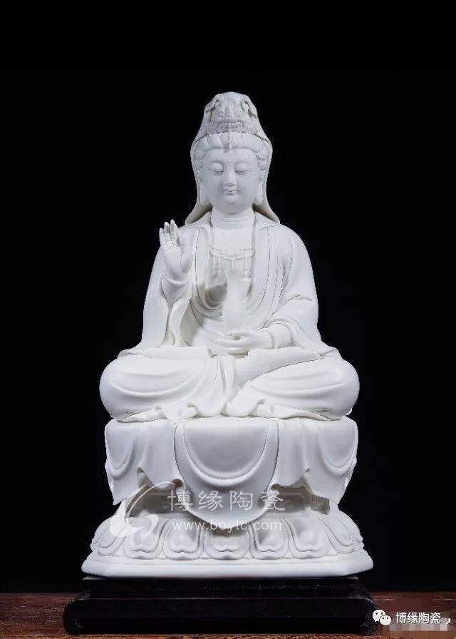 在流传的德化窑瓷塑艺术作品中,以陶瓷为材质雕塑的菩萨形象,面目慈祥、神态逼真,姿态神情各异,衣纹装饰别致,规格大小不一,极大地丰富了中国陶瓷艺术,产生了千姿百态,各臻其美的艺术效果。